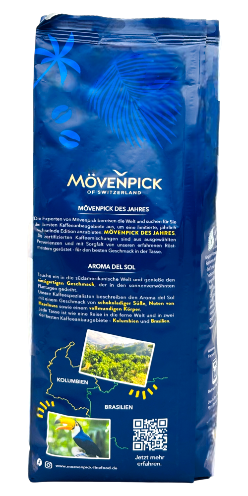 Découvrez l'excellence du café suisse avec le Caffè Crema Aroma del Sol de Mövenpick. Ce mélange haut de gamme d'Arabica et de Robusta offre des arômes intenses de noix et de chocolat, avec une texture soyeuse et une crème onctueuse. Parfait pour l'amateur de café exigeant qui choisit la qualité et la sophistication.