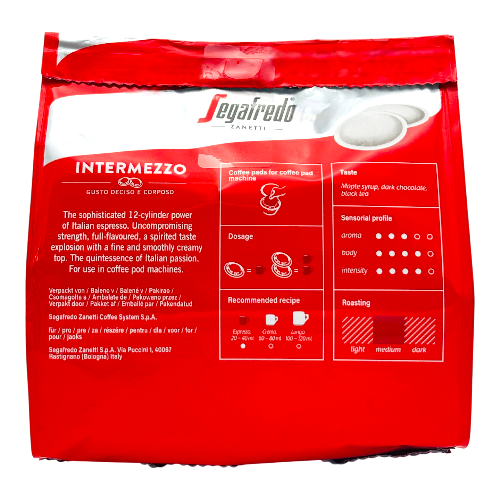 Segafredo Zanetti presenteert de Intermezzo koffiepads, een premium blend die de rijke traditie van Italiaanse koffiecultuur naar jouw keuken brengt. Deze zorgvuldig samengestelde mix van Arabica en Robusta bonen wordt medium gebrand in Segafredo's roasterij in Italië, wat zorgt voor een evenwichtige smaak die zowel krachtig als zacht is. De naam 'Intermezzo' symboliseert een moment van rust en genot.